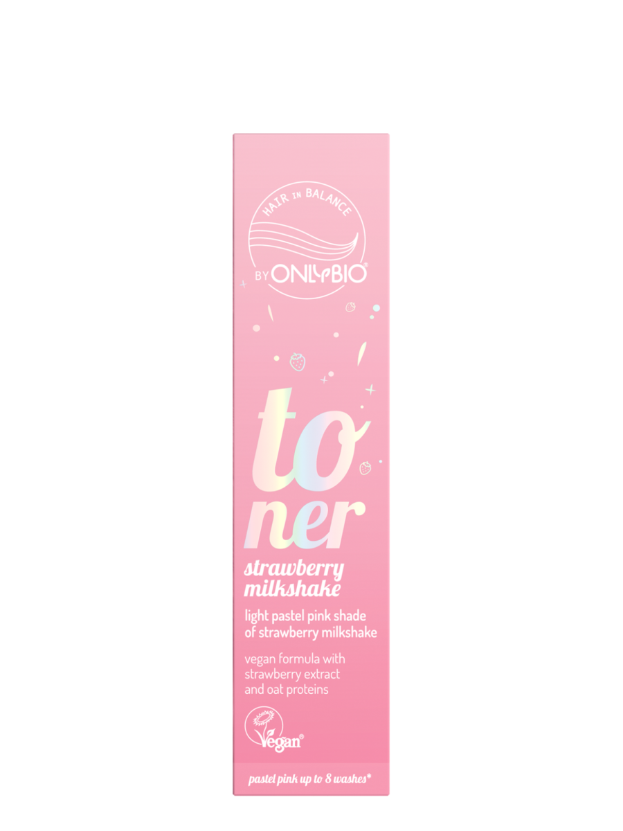 OnlyBio Hair in Balance Toner for blonde hair refreshes your color, giving hair a light pink, pastel “Strawberry Milkshake” shade.
